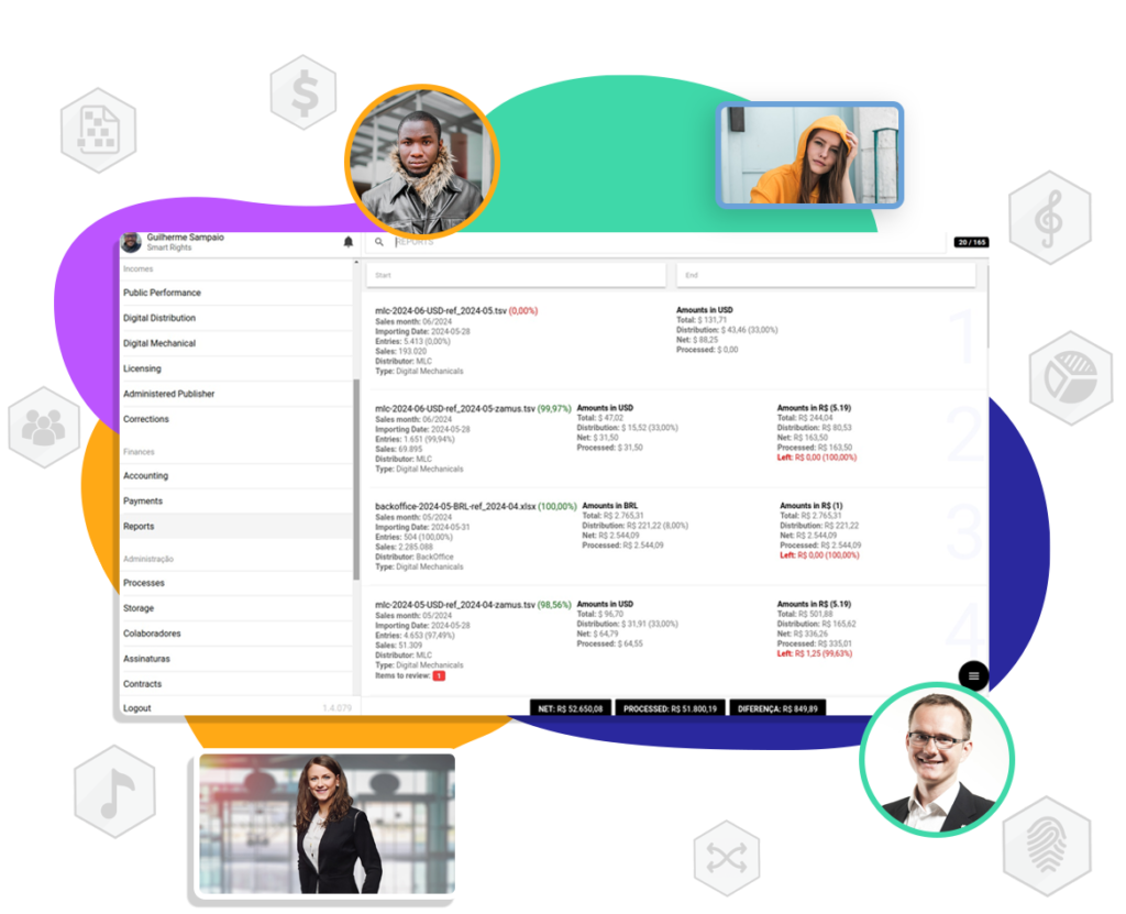 - Processe e normalize relatórios de qualquer fonte (DSPs, editoras, selos, sociedades), eliminando a necessidade de planilhas